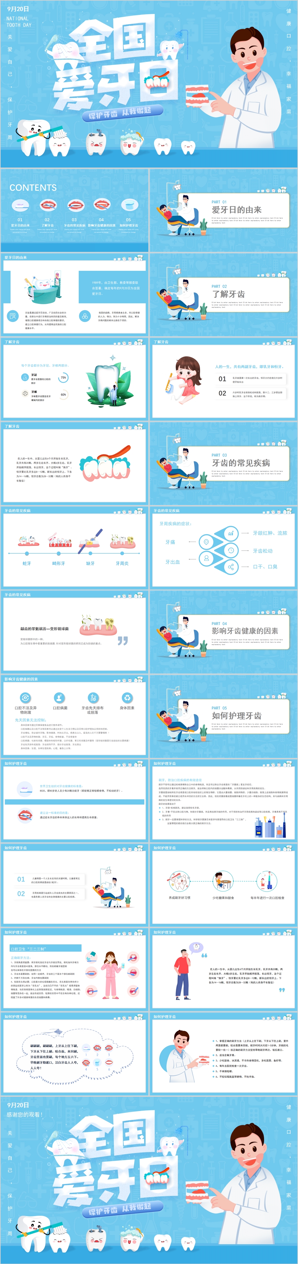 【免费】卡通蓝色全国爱牙日主题班会动态PPT模板