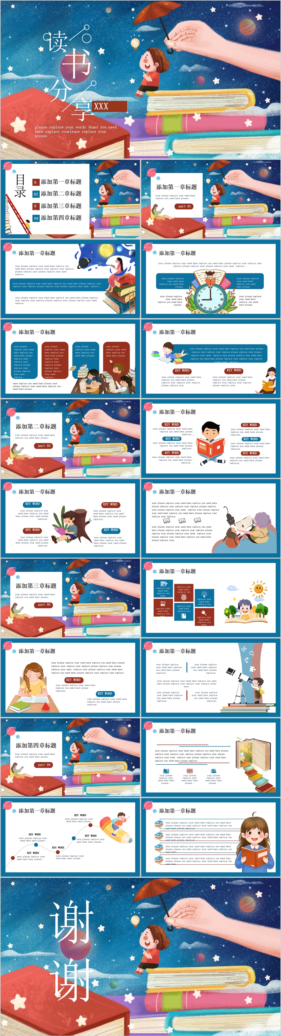【免费】可爱卡通插画风读书分享通用PPT模板